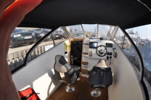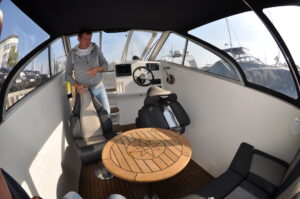 Hybrid boat Ghost 750 is a cabin RIB boat. Such boats are used by navy special forces, police, marine emergency services, military patrol boats, border guards, marine ambulance. Due to appropriate construction of the trunk and its connection with the pneumatic tube such boats can be used in very tough atmospheric conditions assuring safety of the passengers. Ghost 750 is a combination of a special RIB boat and a recreational cabin boat maintaining all the parameters of the RIB boat. Ghost 750 is a boat having a high ergonomic fairing and high internal broadside ensuring safety and comfort of the passengers. The boat was designed in order for an ordinary family with children could safely and comfortably enjoy the beauty of Baltic sea. The trunk was designed basing on the new trends dominating the world’s power boating market as well as those expected in the future. The length of the boat was adapted to the length of the wave most common on the Baltic sea and the width of the trunk assures stability and desired comfort. Ergonomic shapes of the boat; angular as well as streamline fairing, lithe tube, lifted bow, innovative way of fixing the tube, properly profiled redans, deep V of the trunk and its shape guarantee that the boat will surely stay in the lead of hybrid boats. All those components will assure safe and comfortable usage for the whole family. The boat has spacious, well-lit and glazed cabin, where 5 people can rest or avoid alternating atmospheric conditions. Supply of 300 liters of fuel, 40 litres of water, comfortable bathroom with a toilet and a shower, optional heating of the cabin, deck furnished with a table, two armchairs and a broad sofa allows to travel between marinas and at the same time actively trip at the open water. It is possible to optionally roof the deck (cabrio type) which enables passengers to rest on the boat at the evening. Charming lightning of the cabin stimulates senses, comfortable and warm cabin, comfortable bathroom, the sound of seawaves calls for a romantic dinner on the boat. Application of modern and economical engines enables quick and fairly cheap journey along the beautiful coasts of Baltic sea. All the design and application of the boat was thoroughly thought over in order to leave the crowded marina and begin exploring the merits of actively spending free time. Eventually our Baltic is beautiful but there is nobody who praises it as its charm cannot be captured from the port. Ghost 750 will allow to discover Baltic from the outset.
